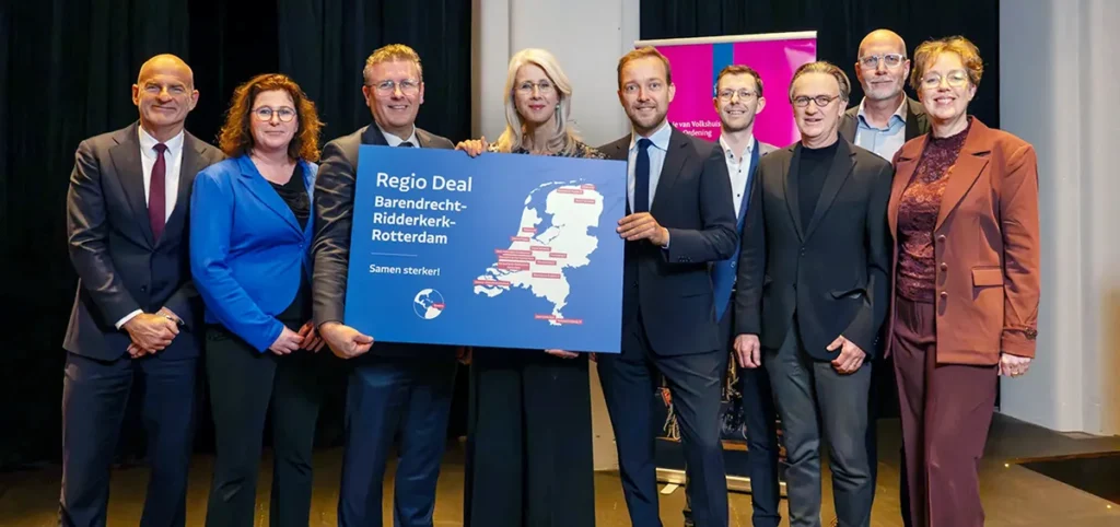 Met de feestelijke landelijke aftrap van de Regio Deals heeft ook de Regio Deal Barendrecht, Ridderkerk, Rotterdam – Samen Sterker! een belangrijke mijlpaal bereikt. Tijdens een bijeenkomst in Utrecht bekrachtigde minister Mona Keijzer (Volkshuisvesting en Ruimtelijke Ordening) samen met regionale bestuurders de start van zestien nieuwe Regio Deals, waaronder de deal voor onze regio. Vanuit de Regio Deal Samen Sterker! waren daarbij aanwezig burgemeester Marco Oosterwijk van de gemeente Ridderkerk en burgemeester Ronald Schneider en wethouder Lennart van der Linden van de gemeente Barendrecht.